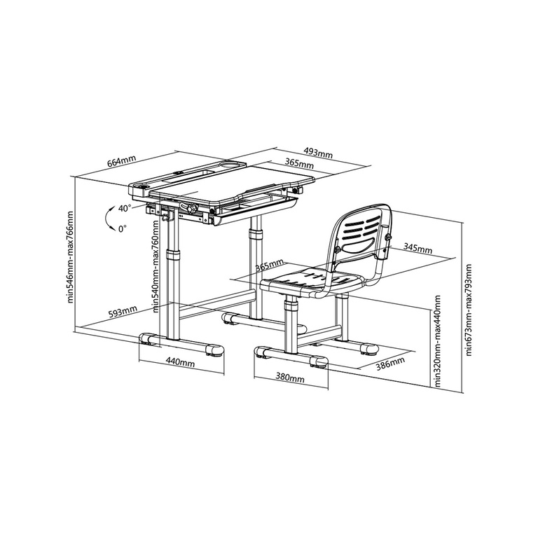 Поверхность учебного стола можно наклонять до 40 °. В ножки парты встроена система корректировки неровной поверхности.