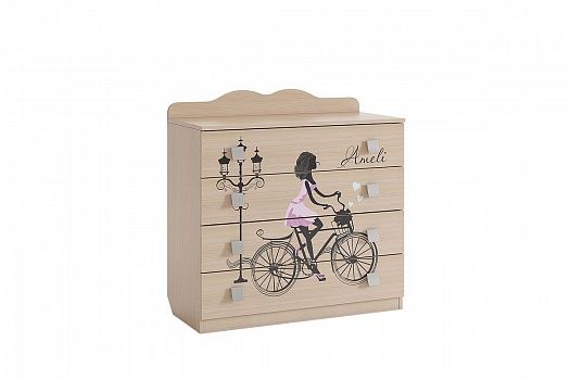 Романтичный комод «Амели» – обрадует каждую девочку. В 4 удобных выдвижных ящиках разместятся все необходимые вещи. Элегантный принтерный рисунок на фасадах выдержан в общем стилистическом решении. Рисунок устойчив к истиранию и ультрафиолету. Детская «Амели»- все, что нужно истинной леди!