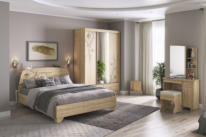 Компоновка состоит из: Виктория-1 Кровать 1.6; Виктория-1 Трюмо; Виктория-1 Пуф; Виктория-1 Шкаф-купе (0.6).